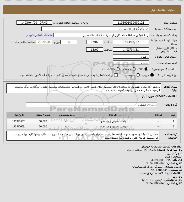 1 -- پلمپ امنیتی و ضد نفوذ عدد 30,000 1403/04/31