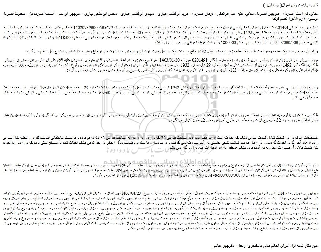 شماره پرونده اجرایی0201491شعبه اول اجرای احکام مدنی اردبیل به موجب درخواست اجرای حکم به شماره دادنامه مربوطه دادنامه مربوطه 140207390000505679 محکوم علیهم محکوم هستند به فروش یک قطعه زمین تحت پلاک یک قطعه زمین به پلاک ثبتی 1492 واقع در بخش یک اردبیل ثبت شده در دفتر مالکیت شماره 29 صفحه 405 به لحاظ غیر قابل تقسیم بودن آن به جهت تعدد وراث و مساحت ملک و مقررات جاری و تقسیم وجوه حاصله از فروش بین وراث مرحومین محترم امامی و انعام اله افسردل به نسبت سهم الارث هر کدام و نیز محکومیت محکوم علیهم به پرداخت هزینه دادرسی به مبلغ 4/618/000 ریال و حق الوکاله وکیل طبق تعرفه قانونی به مبلغ 5/000/000 ریال در حق محکوم لهم ومبلغ 1800000 ریال بابت هزینه اجرائی در حق صندوق دولت