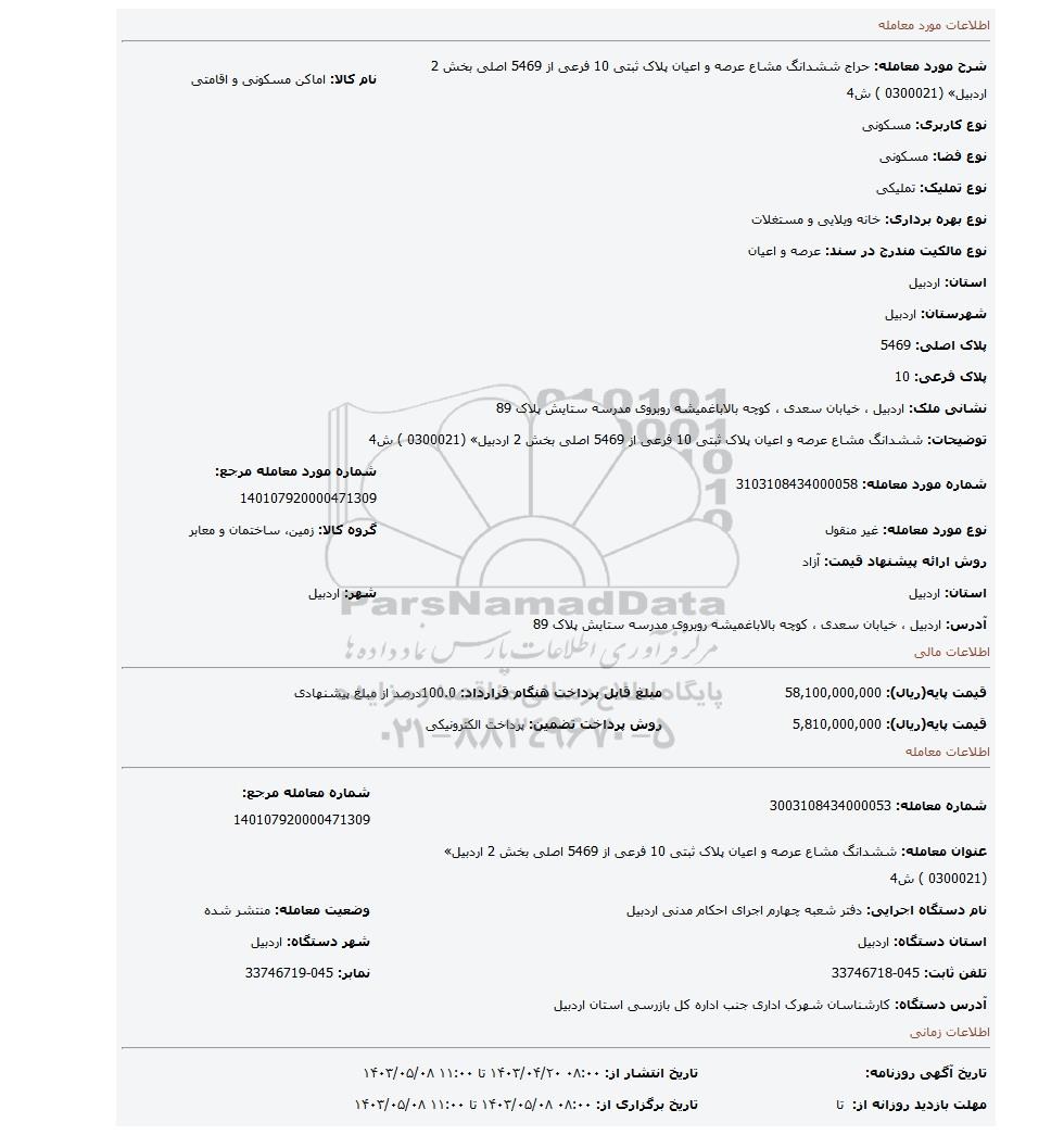 شرح مورد معامله: حراج ششدانگ مشاع عرصه و اعیان پلاک ثبتی 10 فرعی از 5469 اصلی بخش 2 اردبیل» (0300021 ) ش4نام کالا: اماکن مسکونی و اقامتی