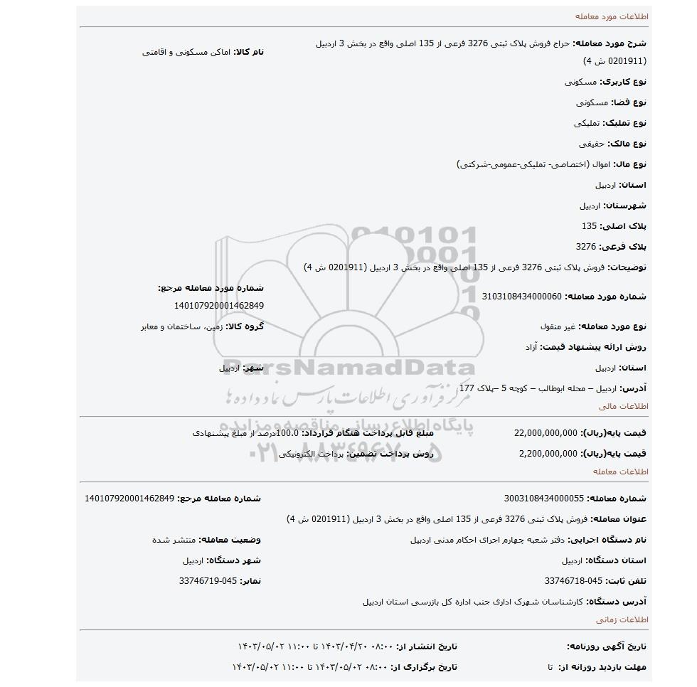عنوان معامله: فروش پلاک ثبتی 3276 فرعی از 135 اصلی واقع در بخش 3 اردبیل (0201911 ش 4) | ||