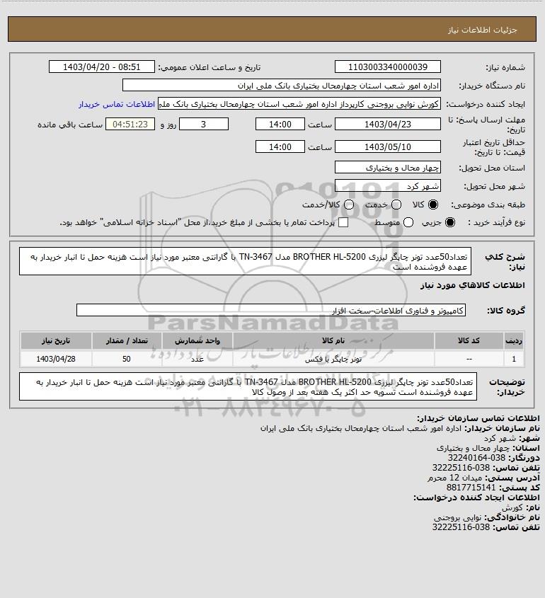 شرح کلی نیاز: تعداد50عدد تونر چاپگر لیزری 5200-BROTHER HL مدل 3467-TN با گارانتی معتبر مورد نیاز است هزینه حمل تا انبار خریدار به عهده فروشنده است