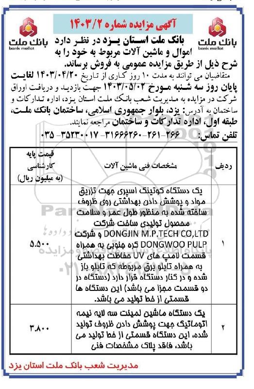 بانک ملت استان یزد در نظر دارد اموال و ماشین آلات مربوط به خود را به شرح ذیل از طریق مزایده عمومی به فروش برساند.