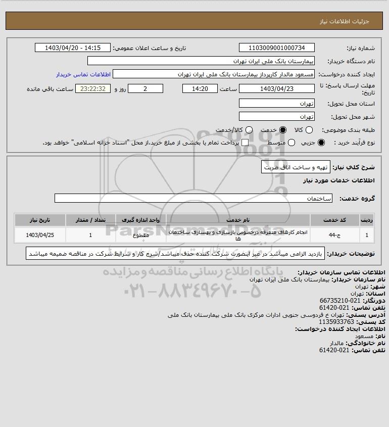 شرح کلی نیاز: تهیه و ساخت اتاق ضربت