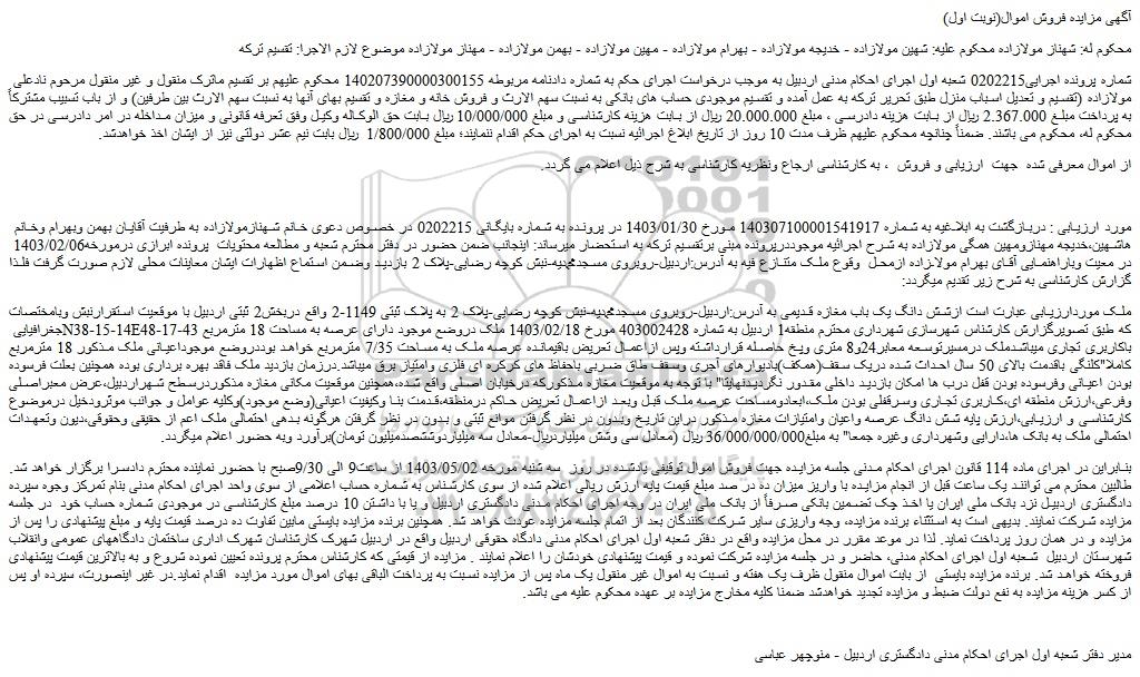 شماره پرونده اجرایی0202215 شعبه اول اجرای احکام مدنی اردبیل به موجب درخواست اجرای حکم به شماره دادنامه مربوطه 140207390000300155 محکوم علیهم بر تقسیم ماترک منقول و غیر منقول مرحوم نادعلی مولازاده (تقسیم و تعدیل اسباب منزل طبق تحریر ترکه به عمل آمده و تقسیم موجودی حساب های بانکی به نسبت سهم الارث و فروش خانه و مغازه و تقسیم بهای آنها به نسبت سهم الارث بین طرفین) و از باب تسبیب مشترکاً به پرداخت مبلغ 2.367.000 ریال از بابت هزینه دادرسی ، مبلغ 20.000.000 ریال از بابت هزینه کارشناسی و مبلغ 10/000/000 ریال بابت حق الوکاله وکیل وفق تعرفه قانونی و میزان مداخله در امر دادرسی در حق محکوم له، محکوم می باشند. ضمناً چنانچه محکوم علیهم ظرف مدت 10 روز از تاریخ ابلاغ اجرائیه نسبت به اجرای حکم اقدام ننمایند؛ مبلغ 1/800/000  ریال بابت نیم عشر دولتی نیز از ایشان اخذ خواهدشد.