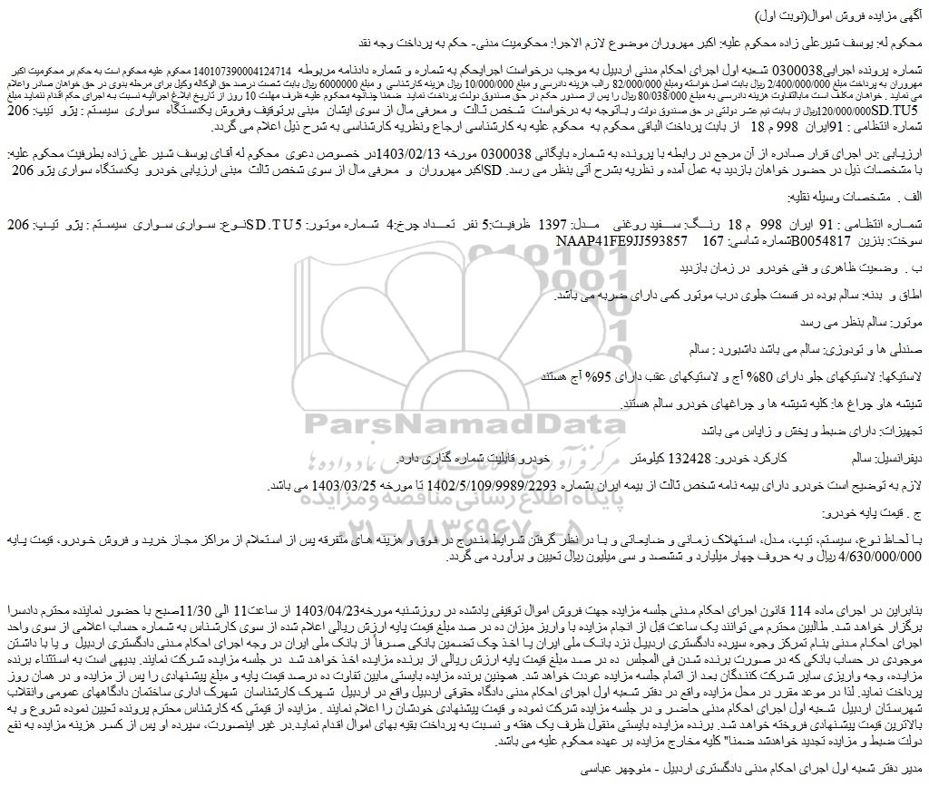 شماره پرونده اجرایی0300038 شعبه اول اجرای احکام مدنی اردبیل به موجب درخواست اجرایحکم به شماره و شماره دادنامه مربوطه 140107390004124714 محکوم علیه محکوم است به حکم بر محکومیت اکبر مهروران به پرداخت مبلغ 2/400/000/000 ریال بابت اصل خواسته ومبلغ 82/000/000 رالب هزینه دادرسی و مبلغ 10/000/000 ریال هزینه کارشناسی و مبلغ 6000000 ریال بابت شصت درصد حق الوکاله وکیل برای مرحله بدوی در حق خواهان صادر واعلام می نماید . خواهان مکلف است مابالتفاوت هزینه دادرسی به مبلغ 80/038/000 ریال را پس از صدور حکم در حق صندوق دولت پرداخت نماید ضمنا چنانچه محکوم علیه ظرف مهلت 10 روز از تاریخ ابلاغ اجرائیه نسبت به اجرای حکم اقدام ننماید مبلغ 120/000/000ریال از بابت نیم عشر دولتی در حق صندوق دولت و باتوجه به درخواست شخص ثالث و معرفی مال از سوی ایشان مبنی برتوقیف وفروش یکدستگاه سواری سیستم : پژو تیپ: 206SD.TU5 شماره انتظامی : 91ایران 998 م 18 از بابت پرداخت الباقی محکوم به محکوم علیه به کارشناسی ارجاع ونظریه کارشناسی به شرح ذیل اعلام می گردد.
