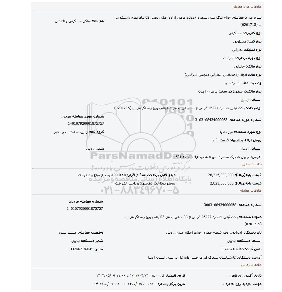 عنوان معامله: پلاک ثبتی شماره 26227 فرعی از 33 اصلی بخش 03 بنام بهروز راستگو ش پ (0201715) | ||