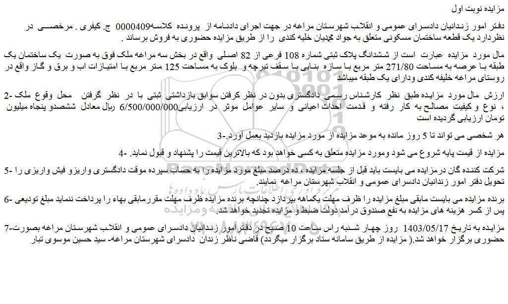مال مورد مزایده عبارت است از ششدانگ پلاک ثبتی شماره 108 فرعی از 82 اصلی واقع در بخش سه مراغه ملک فوق به صورت یک ساختمان یک طبقه با عرصه به مساحت 271/80 متر مربع با سازه بنایی با سقف تیرچه و بلوک به مساحت 125 متر مربع با امتیازات اب و برق و گاز واقع در روستای مراغه خلیفه کندی ودارای یک طبقه میباشد