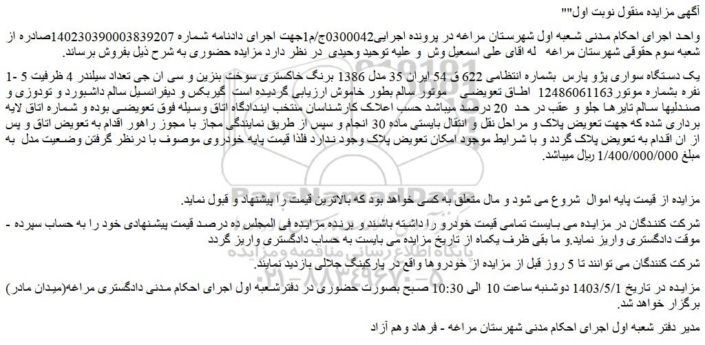 مزایده در تاریخ 1403/5/1 دوشنبه ساعت 10 الی 10:30 صبح بصورت حضوری در دفترشعبه اول اجرای احکام مدنی دادگستری مراغه(میدان مادر) برگزار خواهد شد.