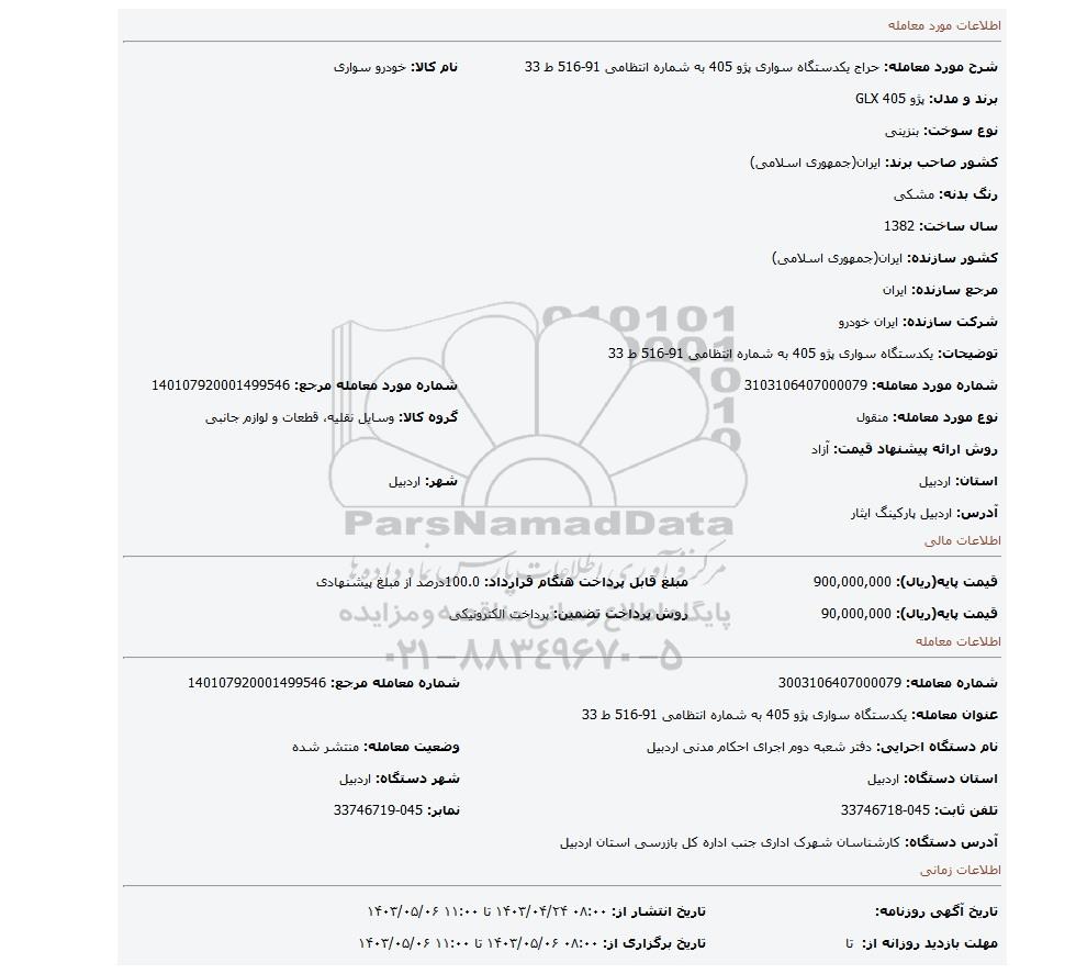 عنوان معامله: یکدستگاه سواری پژو 405 به شماره انتظامی 91-516 ط 33 | ||