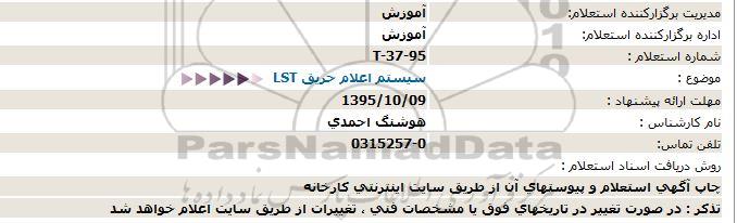 استعلام بها و موضوع استعلام استعلام ، استعلام سیستم اعلام حریق LST به اطلاع کلیه شرکتها و افراد متخصص واجد شرایط میرساند، آگهی گذار در نظر دارد از طریق استعلام بها، نسبت به انتخاب و دریافت پیشنهادات اقدام نماید. این استعلام با کد آگهی ثبت شده در سامانه خبرگزاری پارس نماد : 772882 منتشر شده است. مشخصات استعلام : تاریخ شروع استعلام: 1395/10/01 آخرین مهلت ارسال پیشنهاد قیمت : 1395/10/09 و محل اجرای پروژه : استان اصفهان میباشد. استعلام قیمت مورد درخواست : استعلام ، استعلام سیستم اعلام حریق LST با دستهبندیهای تخصصی و گروه های مرتبط : سیستم های حفاظتی-دوربین مدار بسته،دزدگیر،آیفون تصویری و آنتن مرکزی, سیستم ایمنی ، اتش نشانی،اعلام و اطفای حریق, استعلام اطلاع رسانی میگردد.