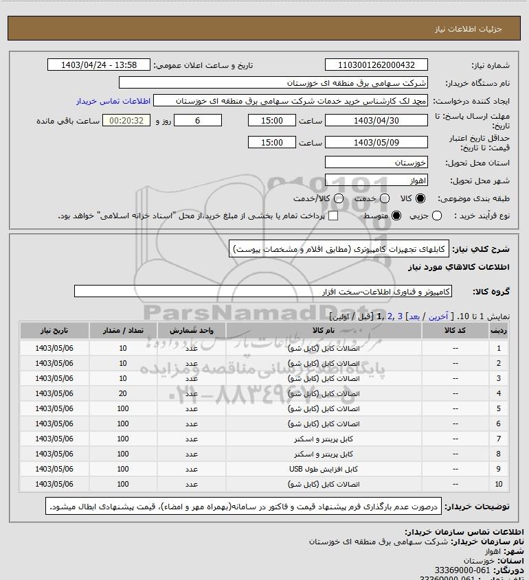 شرح کلی نیاز: کابلهای تجهیزات کامپیوتری (مطابق اقلام و مشخصات پیوست)