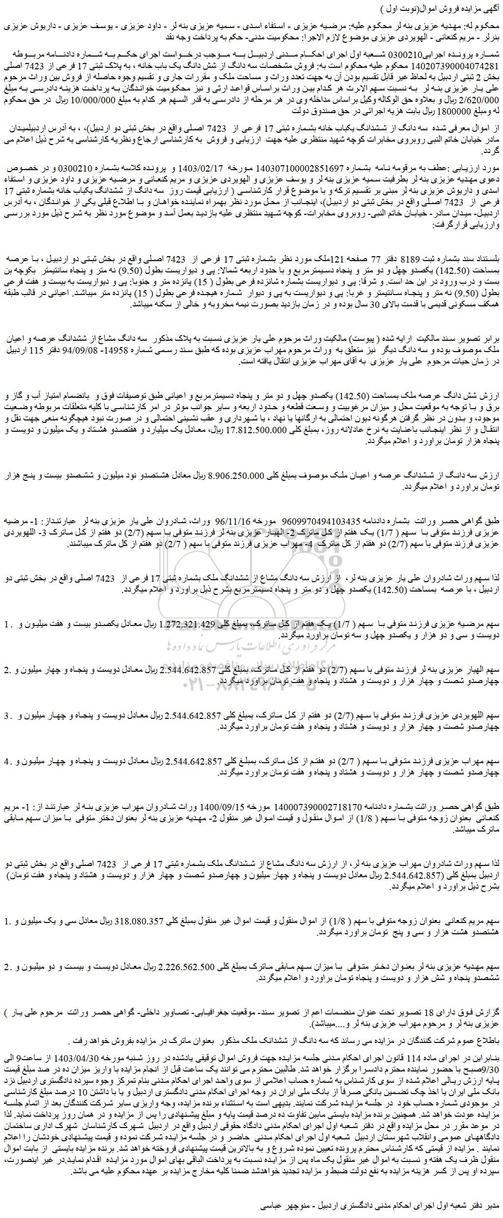 لذا سهم وراث شادروان علی یار عزیزی بنه لر، از ارزش سه دانگ مشاع از ششدانگ ملک بشماره ثبتی 17 فرعی از 7423 اصلی واقع در بخش ثبتی دو اردبیل ، با عرصه بمساحت (142.50) یکصدو چهل و دو متر و پنجاه دسیمترمربع بشرح ذیل براورد و اعلام میگردد.