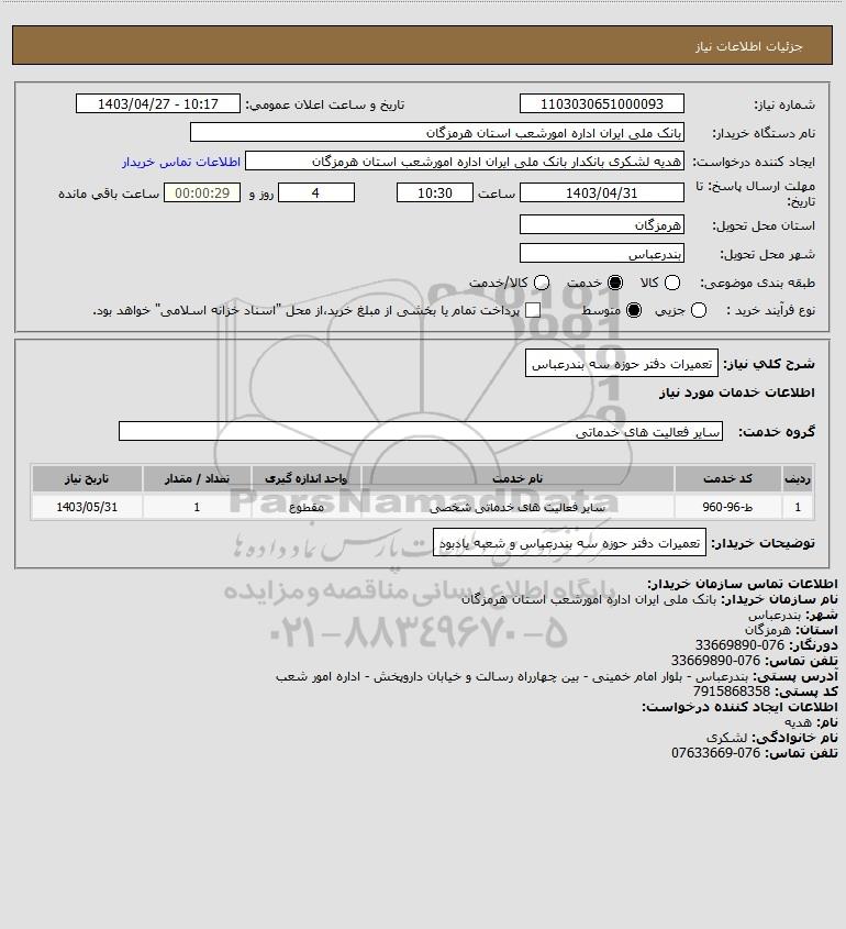 توضیحات خریدار:تعمیرات دفتر حوزه سه بندرعباس و شعبه یادبود