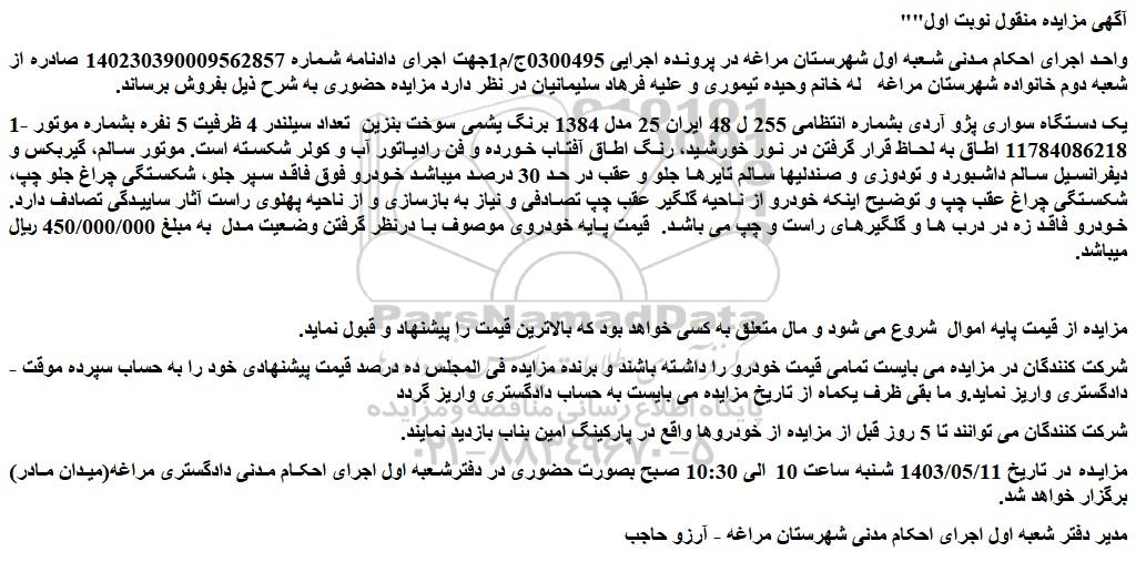 مزایده در تاریخ 1403/05/11 شنبه ساعت 10 الی 10:30 صبح بصورت حضوری در دفترشعبه اول اجرای احکام مدنی دادگستری مراغه(میدان مادر) برگزار خواهد شد.