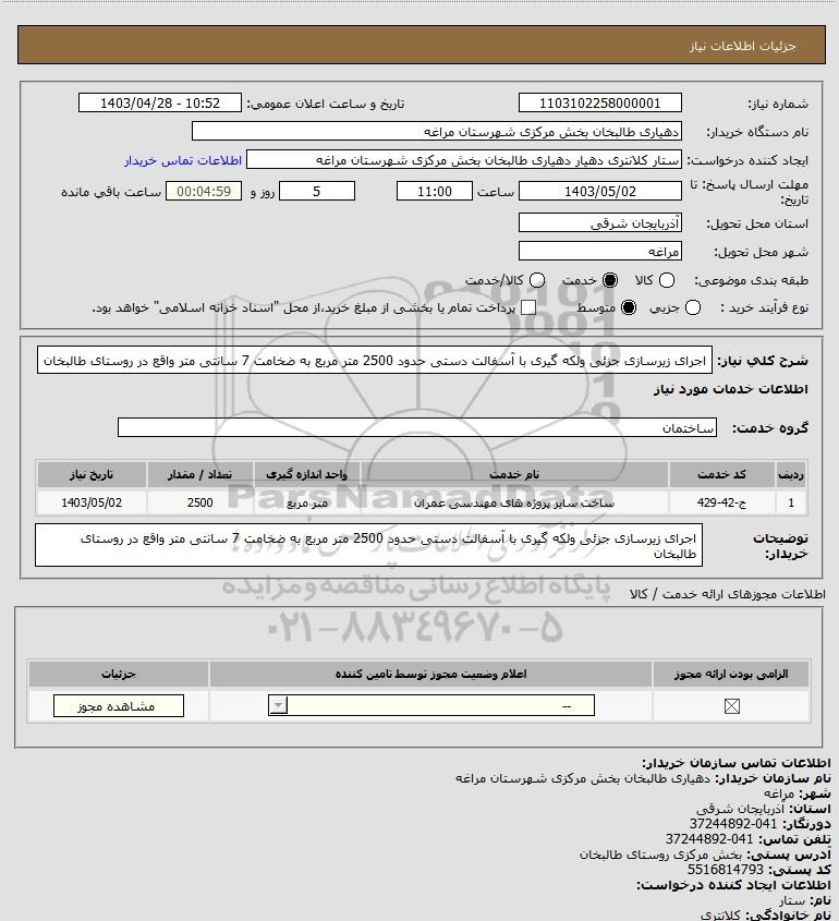 شرح کلی نیاز: اجرای زیرسازی جزئی ولکه گیری با آسفالت دستی حدود 2500 متر مربع به ضخامت 7 سانتی متر واقع در روستای طالبخان