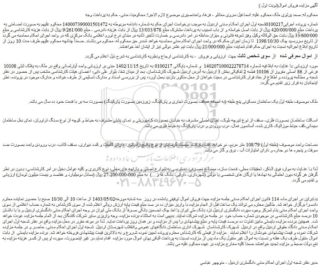 بنابراین در اجرای ماده 114 قانون اجرای احکام مدنی جلسه مزایده جهت فروش اموال توقیفی یادشده در روز  سه شنبه مورخه1403/05/02 از ساعت 10 الی 10/30 صبح با حضور نماینده محترم دادسرا برگزار خواهد شد. طالبین محترم می توانند یک ساعت قبل از انجام مزایده با واریز میزان ده در صد مبلغ قیمت پایه ارزش ریالی اعلام شده از سوی کارشناس به شماره حساب اعلامی از سوی واحد اجرای احکام مدنی بنام تمرکز وجوه سپرده دادگستری اردبیل نزد بانک ملی ایران یا اخذ چک تضمین بانکی صرفاً از بانک ملی ایران در وجه اجرای احکام مدنی دادگستری اردبیل و یا با داشتن 10 درصد مبلغ کارشناسی در موجودی شماره حساب خود  در جلسه مزایده شرکت نمایند. بدیهی است به استثناء برنده مزایده، وجه واریزی سایر شرکت کنندگان بعد از اتمام جلسه مزایده عودت خواهد شد. همچنین برنده مزایده بایستی مابین تفاوت ده درصد قیمت پایه و مبلغ پیشنهادی را پس از مزایده و در همان روز پرداخت نماید. لذا در موعد مقرر در محل مزایده واقع در دفتر شعبه اول اجرای احکام مدنی دادگاه حقوقی اردبیل واقع در اردبیل  شهرک کارشناسان  شهرک اداری ساختمان دادگاههای عمومی وانقلاب شهرستان اردبیل  شعبه اول اجرای احکام مدنی، حاضر و در جلسه مزایده شرکت نموده و قیمت پیشنهادی خودشان را اعلام نمایند . مزایده از قیمتی که کارشناس محترم پرونده تعیین نموده شروع و به بالاترین قیمت پیشنهادی فروخته خواهد شد. برنده مزایده بایستی  از بابت اموال منقول ظرف یک هفته و نسبت به اموال غیر منقول یک ماه پس از مزایده نسبت به پرداخت الباقی بهای اموال مورد مزایده  اقدام نماید.در غیر اینصورت، سپرده او پس از کسر هزینه مزایده به نفع دولت ضبط و مزایده تجدید خواهدشد ضمنا کلیه مخارج مزایده بر عهده محکوم علیه می باشد.