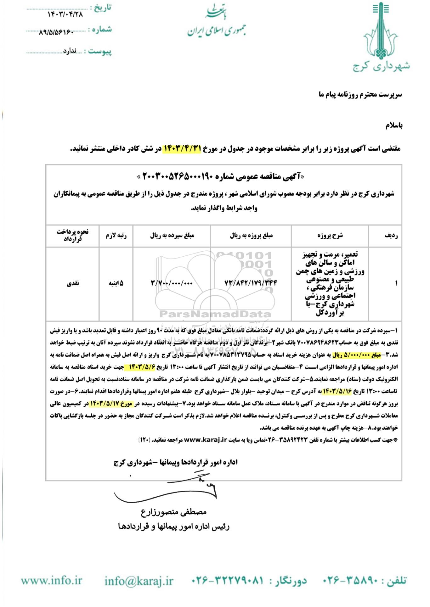 | تعمیر، مرمت و تجهیز اماکن و سالن های ورزشی و زمین های چمن طبیعی و مصنوعی سازمان فرهنگی، اجتماعی و ورزشی شهرداری کرج- با برآورد کل | 73.842.179.344 | 3.700.000.000 | 5 ابنیه | نقدی |