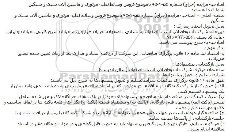 مزایده عمومی مزایده فروش وسائط نقلیه موتوری و ماشین آلات سبک و سنگین اصلاحیه برگزار میگردد. از کلیه افراد متخصص و شرکتهای واجد شرایط دعوت به عمل میآید تا در این مزایده با کد خبرگزاری پارس نماد : 774681 شرکت نمایند تاریخ شروع مزایده : 1395/10/05 مهلت شرکت در مزایده: تا پایان روز 1395/10/15 مکان برگزاری اموال واگذاری استانهای اصفهان و دستهبندیهای مربوط به این حراجی موتور سیکلت, ماشین آلات سنگین و نیمه سنگین, انواع خودرو سبک میباشد.