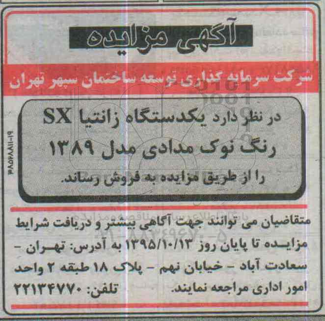 مزایده عمومی مزایده یک دستگاه زانتیا sx برگزار میگردد. از کلیه افراد متخصص و شرکتهای واجد شرایط دعوت به عمل میآید تا در این مزایده با کد خبرگزاری پارس نماد : 774745 شرکت نمایند تاریخ شروع مزایده : 1395/10/06 مهلت شرکت در مزایده: تا پایان روز 1395/10/13 مکان برگزاری اموال واگذاری استانهای تهران و دستهبندیهای مربوط به این حراجی انواع خودرو سبک میباشد.