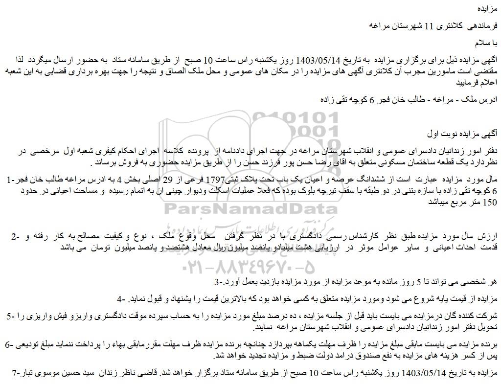 1-مال مورد  مزایده  عبارت  است از ششدانگ عرصه و اعیان یک باب تحت پلاک ثبتی1797 فرعی از 29 اصلی بخش 4 به ادرس مراغه طالب خان فجر 6 کوچه تقی زاده با سازه بتنی در دو طبقه با سقف تیرچه بلوک بوده که فعلا عملیات اسکلت ودیوار چینی ان به اتمام رسیده  و مساحت اعیانی در حدود 150 متر مربع میباشد
