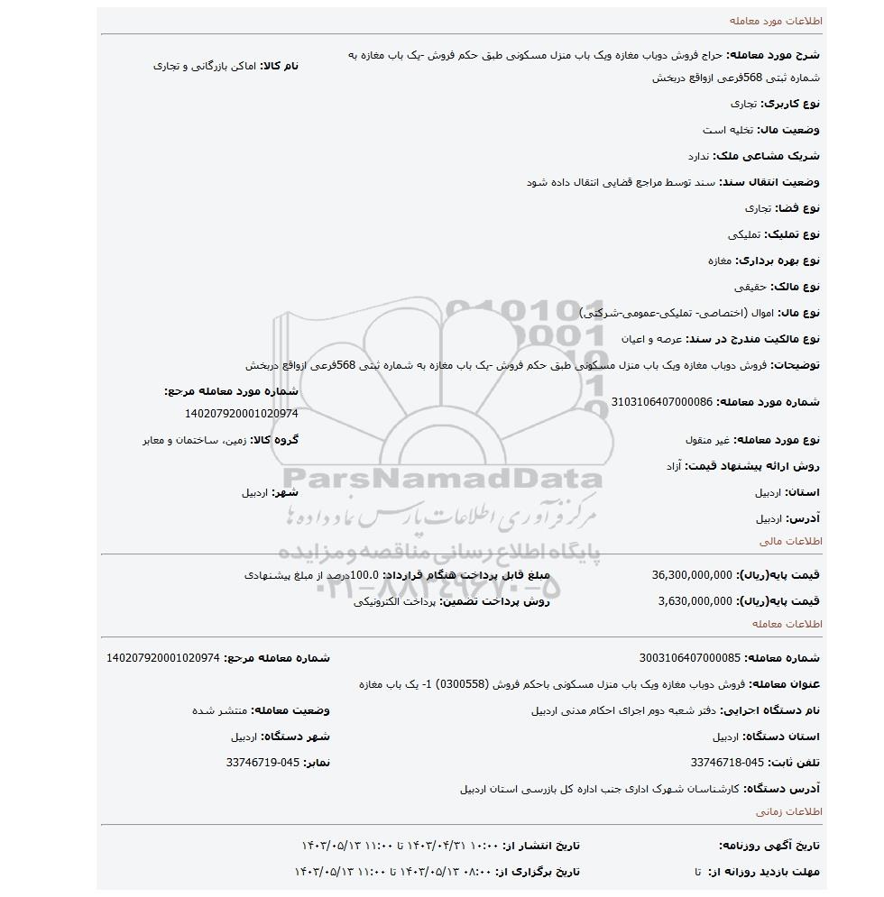 شرح مورد معامله: حراج فروش دوباب مغازه ویک باب منزل مسکونی طبق حکم فروش -یک باب مغازه به شماره ثبتی 568فرعی ازواقع دربخش | نام کالا: اماکن بازرگانی و تجاری | |