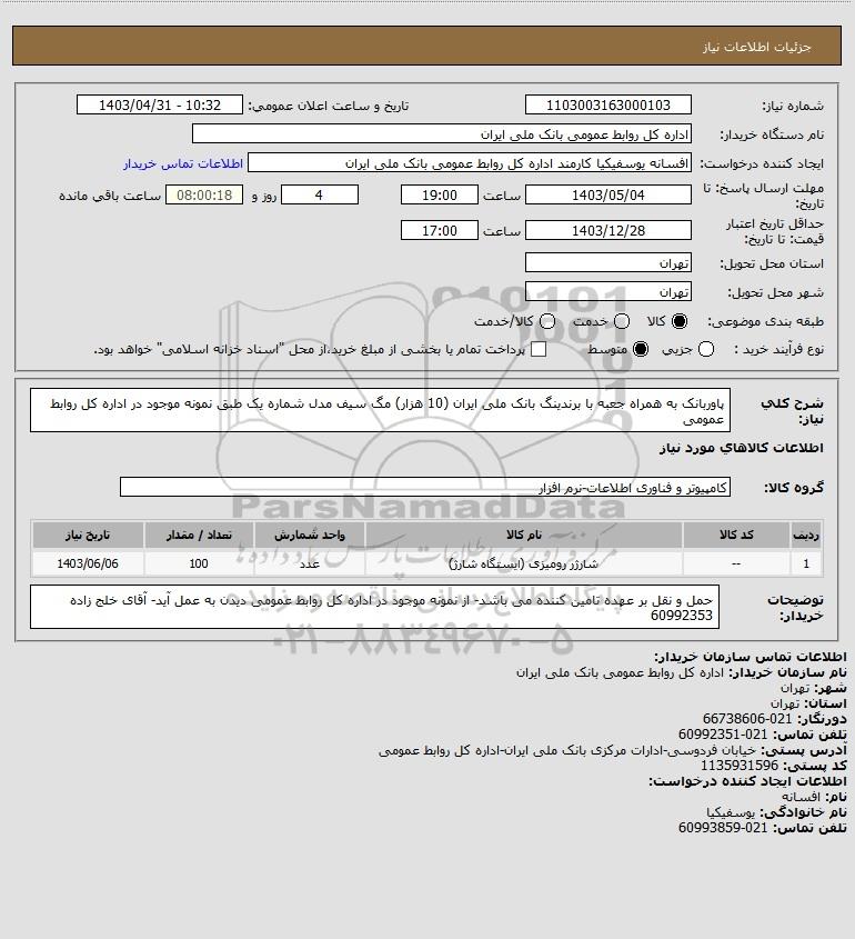 شرح کلی نیاز: پاوربانک به همراه جعبه با برندینگ بانک ملی ایران (10 هزار) مگ سیف مدل شماره یک طبق نمونه موجود در اداره کل روابط عمومی