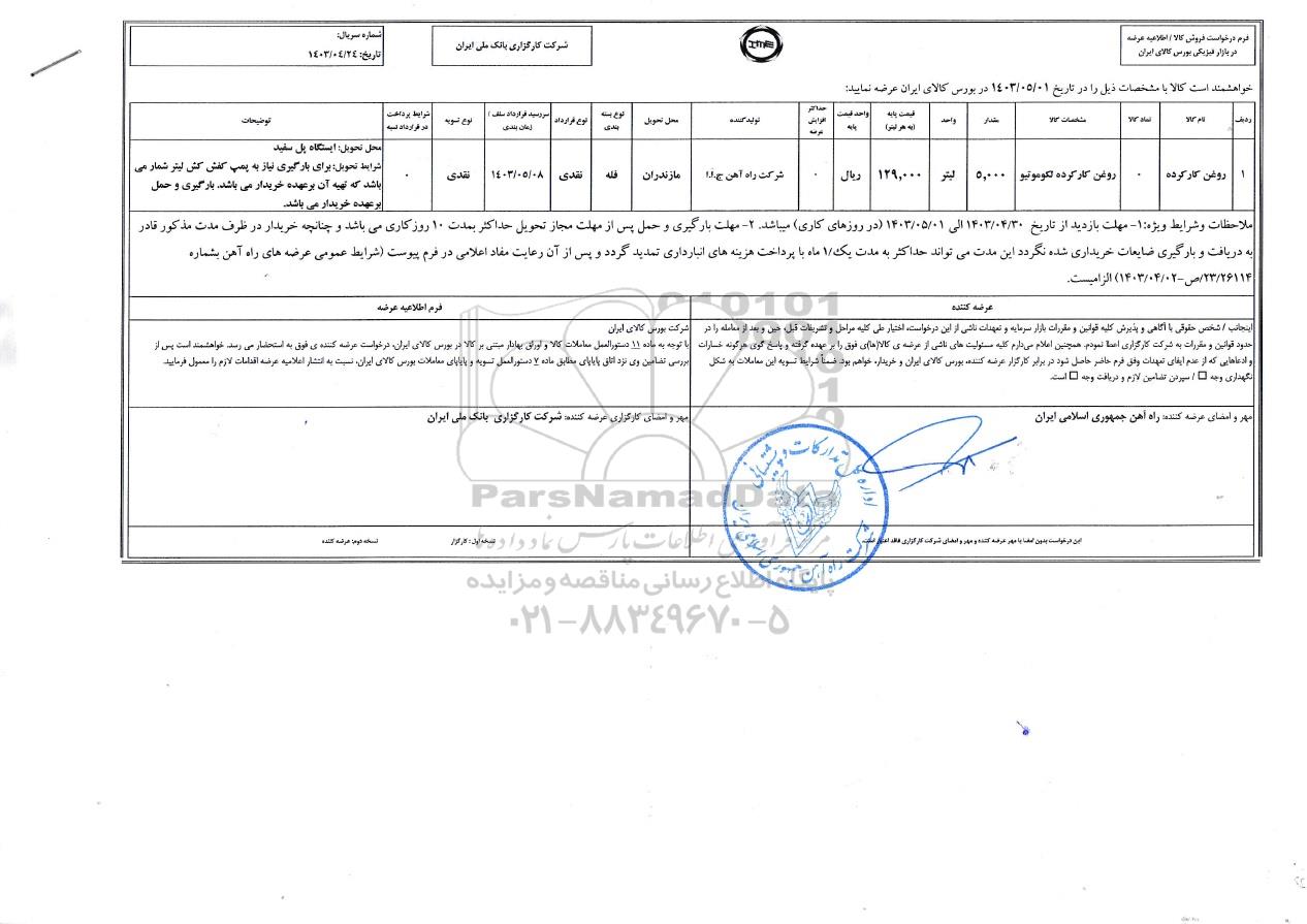 خواهشمند است کالا با مشخصات ذیل را در تاریخ 1403.05.01 در بورس کالای ایران عرضه نمایید: