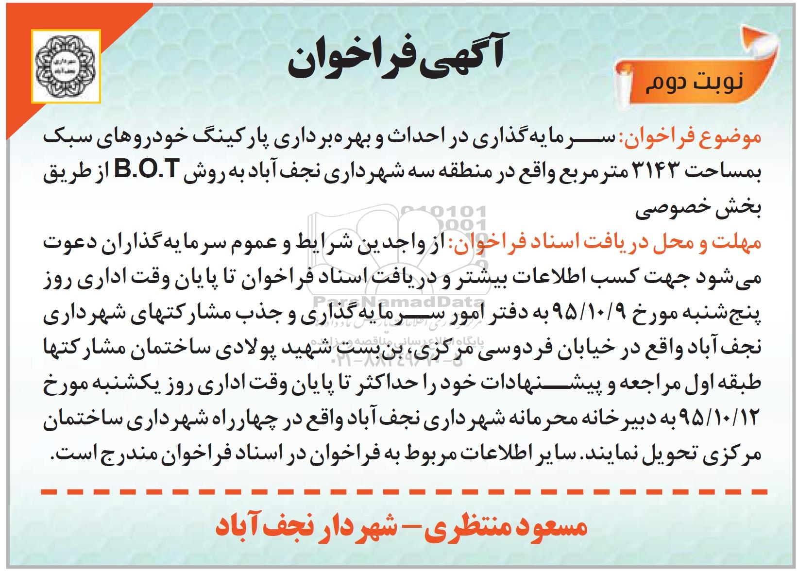 موضوع فراخوان: سرمایه گذاری در احداث و بهره برداری پارکینگ خودروهای سبک بمساحت 3143 مترمربع واقع در منطقه سه شهرداری نجف آباد به روش B.O.T از طریق بخش خصوصی