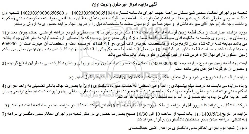 شعبه دوم اجرای احکام مدنی شهرستان مراغه جهت اجرای دادنامه شماره 140230390006651044 و 140230390006650560 شعبه اول دادگاه عمومی حقوقی دادگستری شهرستان مراغه درنظردارد یک قطعه زمین قولنامه ای متعلق به آقای سینا فتحی بخواسته محکومیت مدنی (حکم به پرداخت وجه نقد )درحق آقای مهرداد دانش فر و سیدرضا میر فردوسیان معتمد با مشخصات ذیل را ازطریق انجام مزایده حضوری به فروش برساند: