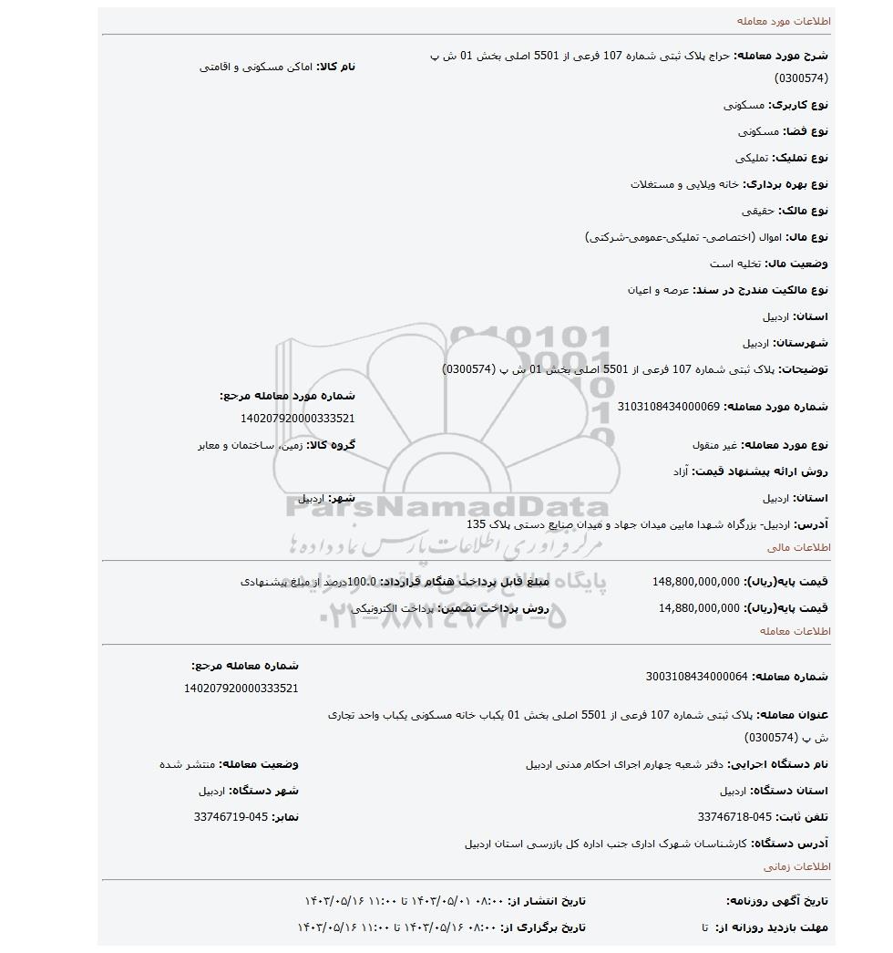 شرح مورد معامله: حراج پلاک ثبتی شماره 107 فرعی از 5501 اصلی بخش 01 ش پ (0300574)نام کالا: اماکن مسکونی و اقامتی