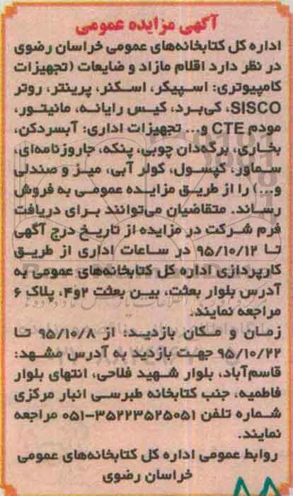 اداره کل کتابخانه های عمومی خراسان رضوی در نظر دارد اقلام مازاد و ضایعات (تجهیزات کامپیوتری: اسپیکر، اسکنر، پرینتر، روتر sisco، کی برد، کیس رایانه، مانیتور ، مودم cte و ...
