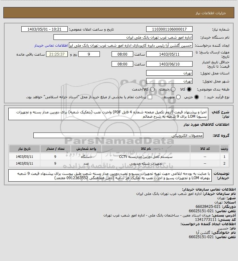 استعلام اجرا و پیشنهاد قیمت (لزوم تکمیل صفحه شماره 4 فایل PDF) واجرت نصب (بتفکیک شعبه) برای دوربین مدار بسته و تجهیزات پسیوبا LOM برای 9 شعبه به شرح ضمائم, استعلام اجرا و پیشنهاد قیمت (لزوم تکمیل صفحه شماره 4 فایل PDF) واجرت نصب (بتفکیک شعبه) برای دوربین مدار بسته و تجهیزات پسیوبا LOM برای 9 شعبه به شرح ضمائم