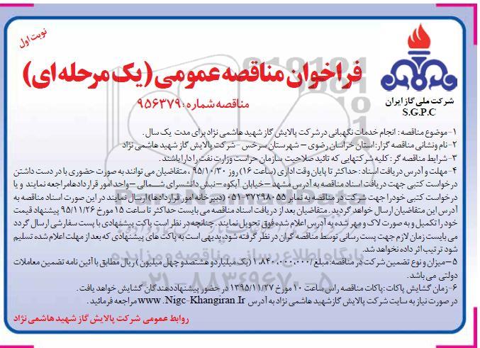1- موضوع مناقصه : انجام خدمات نگهبانی در شرکت پالایش گاز شهید هاشمی نژاد برای مدت یکسال