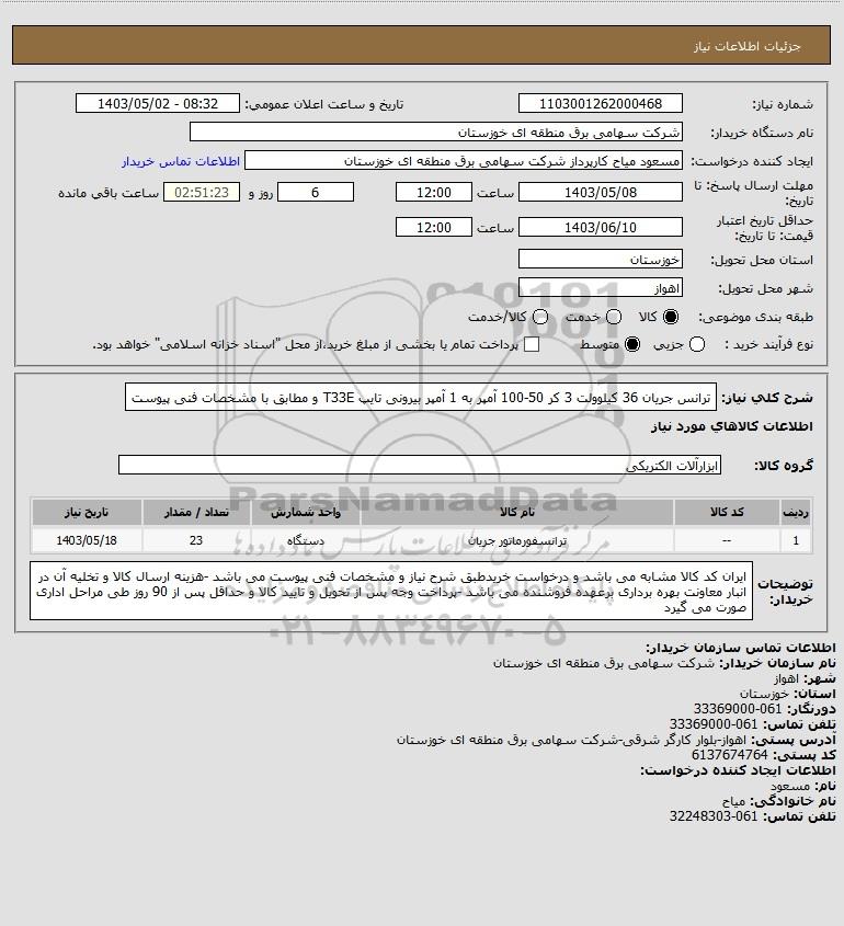 شرح کلی نیاز: ترانس جریان 36 کیلوولت 3 کر 50-100 آمپر به 1 آمپر بیرونی تایپ T33E و مطابق با مشخصات فنی پیوست