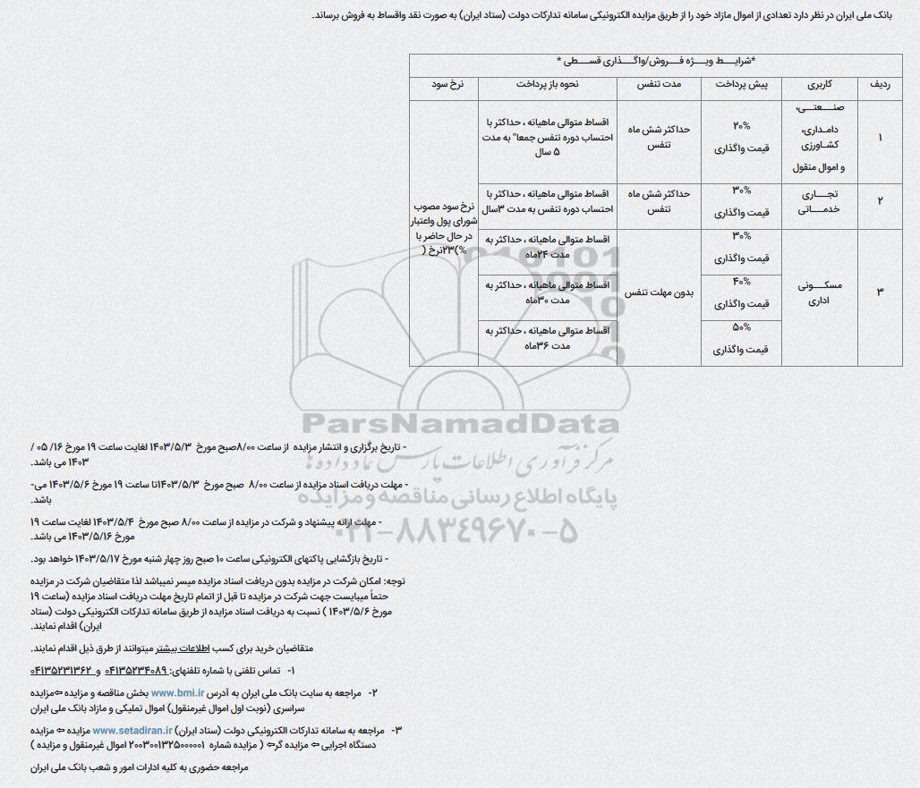 بانک ملی ایران در نظر دارد تعدادی از اموال مازاد خود را از طریق مزایده الکترونیکی سامانه تدارکات دولت (ستاد ایران) به صورت نقد واقساط به فروش برساند.