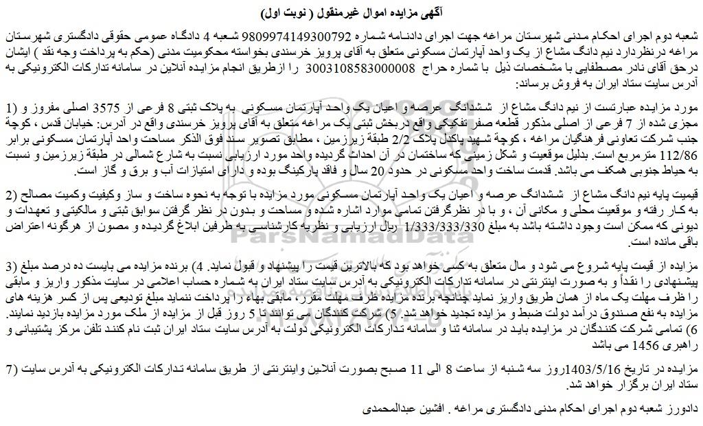 شعبه دوم اجرای احکام مدنی شهرستان مراغه جهت اجرای دادنامه شماره 9809974149300792 شعبه 4 دادگاه عمومی حقوقی دادگستری شهرستان مراغه درنظردارد نیم دانگ مشاع از یک واحد آپارتمان مسکونی متعلق به آقای پرویز خرسندی بخواسته محکومیت مدنی (حکم به پرداخت وجه نقد ) ایشان درحق آقای نادر مصطفایی با مشخصات ذیل  با شماره حراج  3003108583000008  را ازطریق انجام مزایده آنلاین در سامانه تدارکات الکترونیکی به آدرس سایت ستاد ایران به فروش برساند: