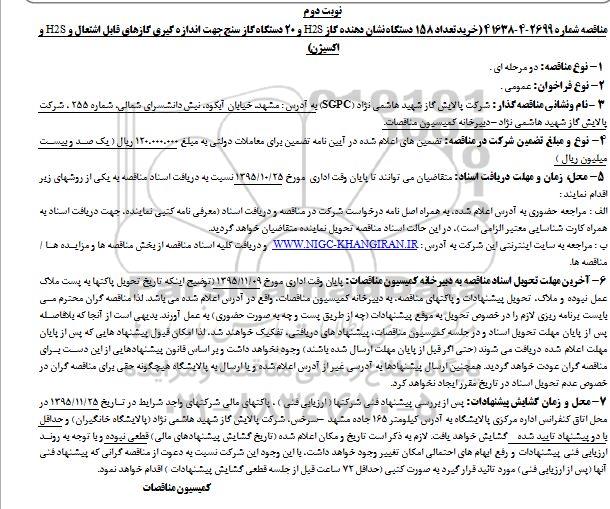شماره 2699-4-41638 (خرید تعداد 158 دستگاه نشان دهنده گاز H2S و 20 دستگاه گازسنج جهت اندازه گیری گازهای قابل اشتعال و H2S و اکسیژن)