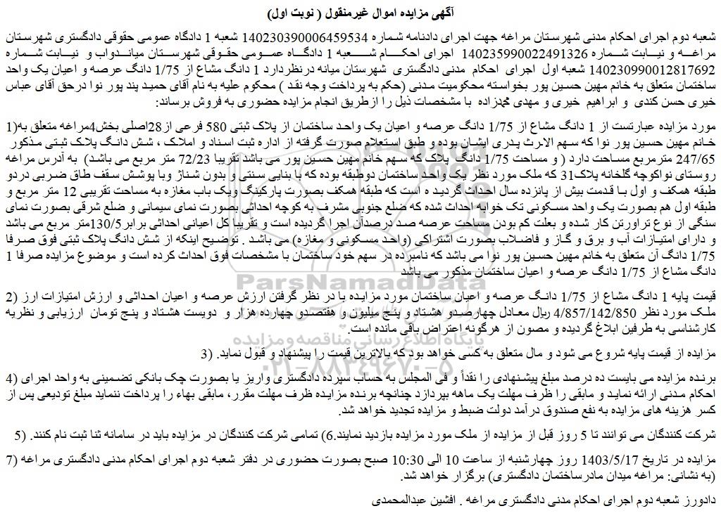 شعبه دوم اجرای احکام مدنی شهرستان مراغه جهت اجرای دادنامه شماره 140230390006459534 شعبه 1 دادگاه عمومی حقوقی دادگستری شهرستان مراغه و نیابت شماره 140235990022491326  اجرای احکام شعبه 1 دادگاه عمومی حقوقی شهرستان میاندواب و  نیابت شماره 140230990012817692 شعبه اول  اجرای  احکام  مدنی دادگستری  شهرستان میانه درنظردارد 1 دانگ مشاع از 1/75 دانگ عرصه و اعیان یک واحد ساختمان متعلق به خانم مهین حسین پور بخواسته محکومیت مدنی (حکم به پرداخت وجه نقد ) محکوم علیه به نام آقای حمید پند پور نوا درحق آقای عباس خیری حسن کندی  و ابراهیم  خیری و مهدی محمدزاده  با مشخصات ذیل را ازطریق انجام مزایده حضوری به فروش برساند: