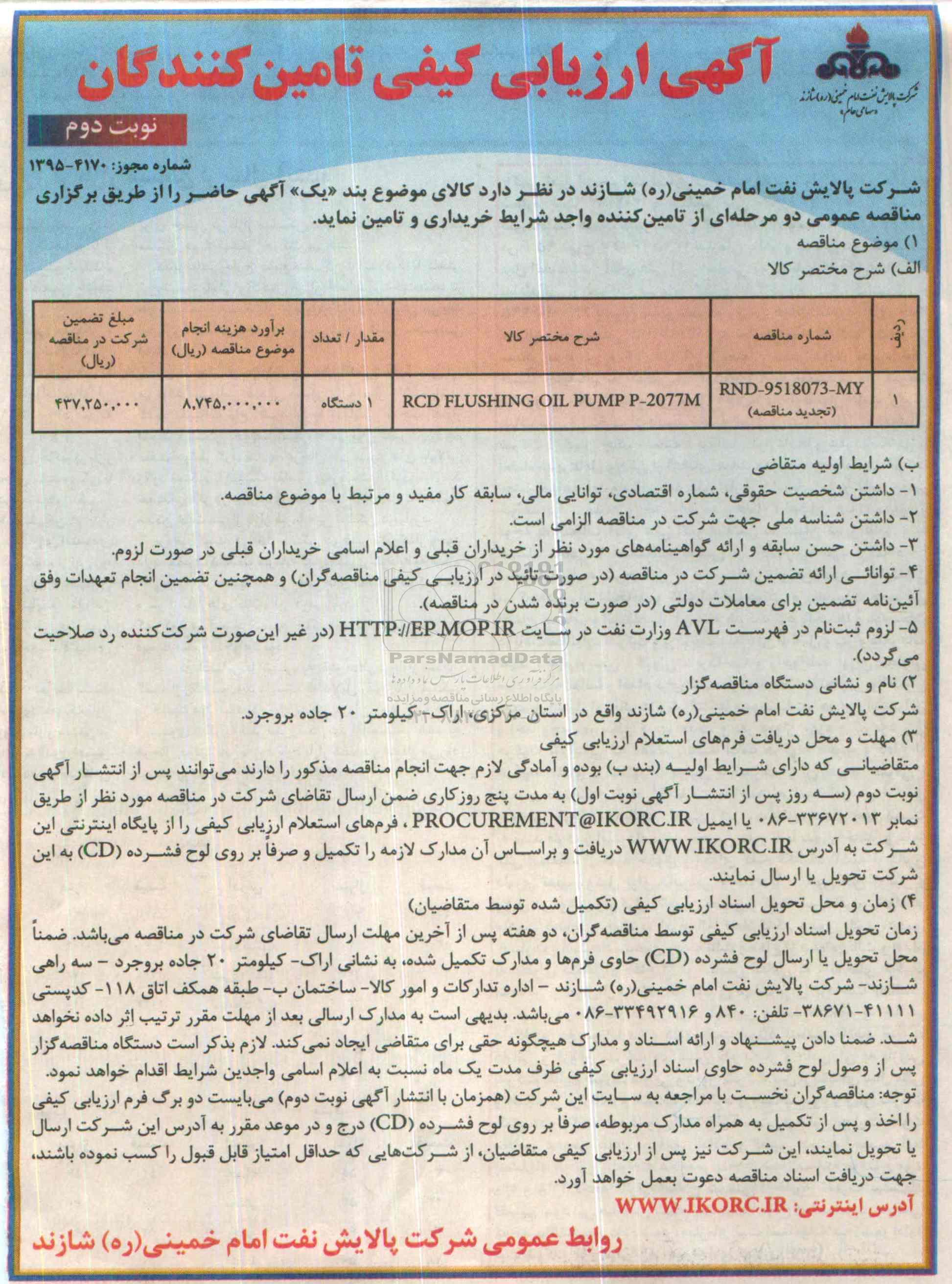 مناقصه خرید 2077M-RCD FLUSHING OIL PUMP P نوبت دوم از کلیه افراد متخصص و شرکتها واجد شرایط دعوت به عمل میآید در مناقصه با کد خبرگزاری پارس نماد: 776942 شرکت نمایند.