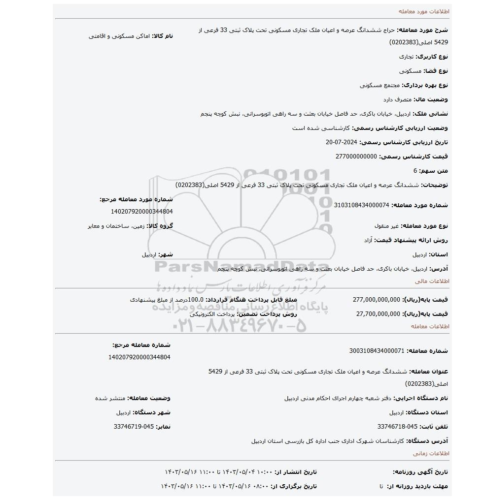 مزایده عمومی مزایده، ششدانگ عرصه و اعیان ملک تجاری مسکونی تحت پلاک ثبتی 33 فرعی از 5429 اصلی(0202383) برگزار میگردد. از کلیه افراد متخصص و شرکت‌های واجد شرایط دعوت به عمل می‌آید تا در این مزایده با کد خبرگزاری پارس نماد : 7770500 شرکت نمایند تاریخ شروع مزایده : 1403/05/04 مهلت شرکت در مزایده: تا پایان روز 1403/05/16 مکان برگزاری اموال واگذاری استان‌های اردبیل و دسته‌بندی‌های مربوط به این حراجی واگذاری ورزشگاه، پارکینگ، غرفه و بوفه, املاک و زمین میباشد. اطلاعات دقیق‌تر درباره شرایط شرکت در مزایده آنلاین و نحوه ارسال مدارک، الزامات پروژه و دریافت اسناد مزایده و تاریخ بازگشایی پاکت‌ها، در بخش اطلاعات تکمیلی این آگهی درج شده است.
