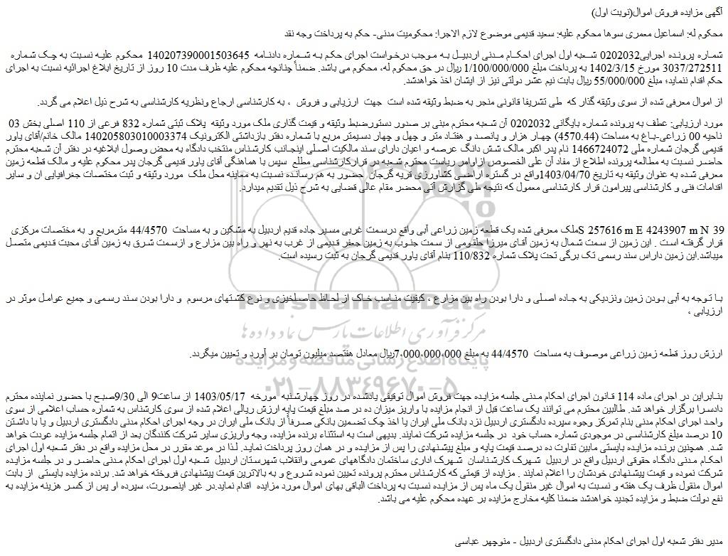 شعبه صادر کننده:شعبه اول اجرای احکام مدنی دادگستری شهرستان اردبیل/قدیم