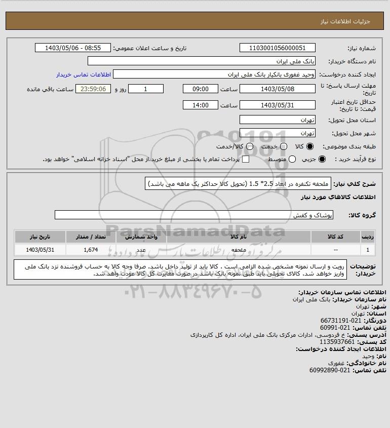توضیحات خریدار:رویت و ارسال نمونه مشخص شده الزامی است . کالا باید از تولید داخل باشد. صرفا وجه کالا به حساب فروشنده نزد بانک ملی واریز خواهد شد. کالای تحویلی باید طبق نمونه بانک باشد در صورت مغایرت کل کالا عودت واهد شد.