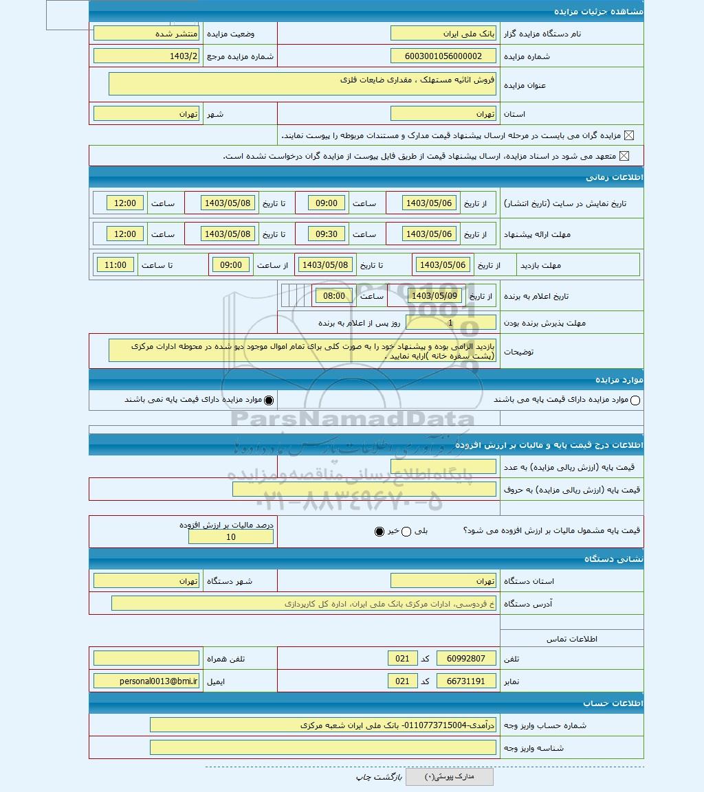 | نام دستگاه مزایده گزار | بانک ملی ایران | وضعیت مزایده | منتشر شده | |