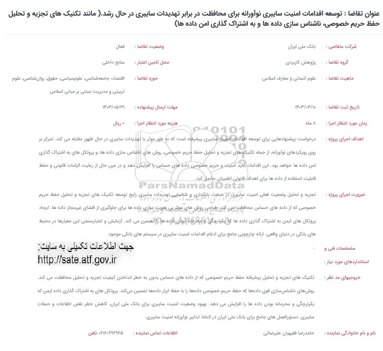 علاقه‌مندان می‌توانند جهت دریافت اسناد و اطلاعات تکمیلی، فراخوان توسعه اقدامات امنیت سایبری نواورانه برای محافظت در برابر تهدیدات سایبری در حال رشد با سامانه مناقصات و مزایدات ایران پارس‌نماد داده ها 88349670 تماس حاصل نمایند.