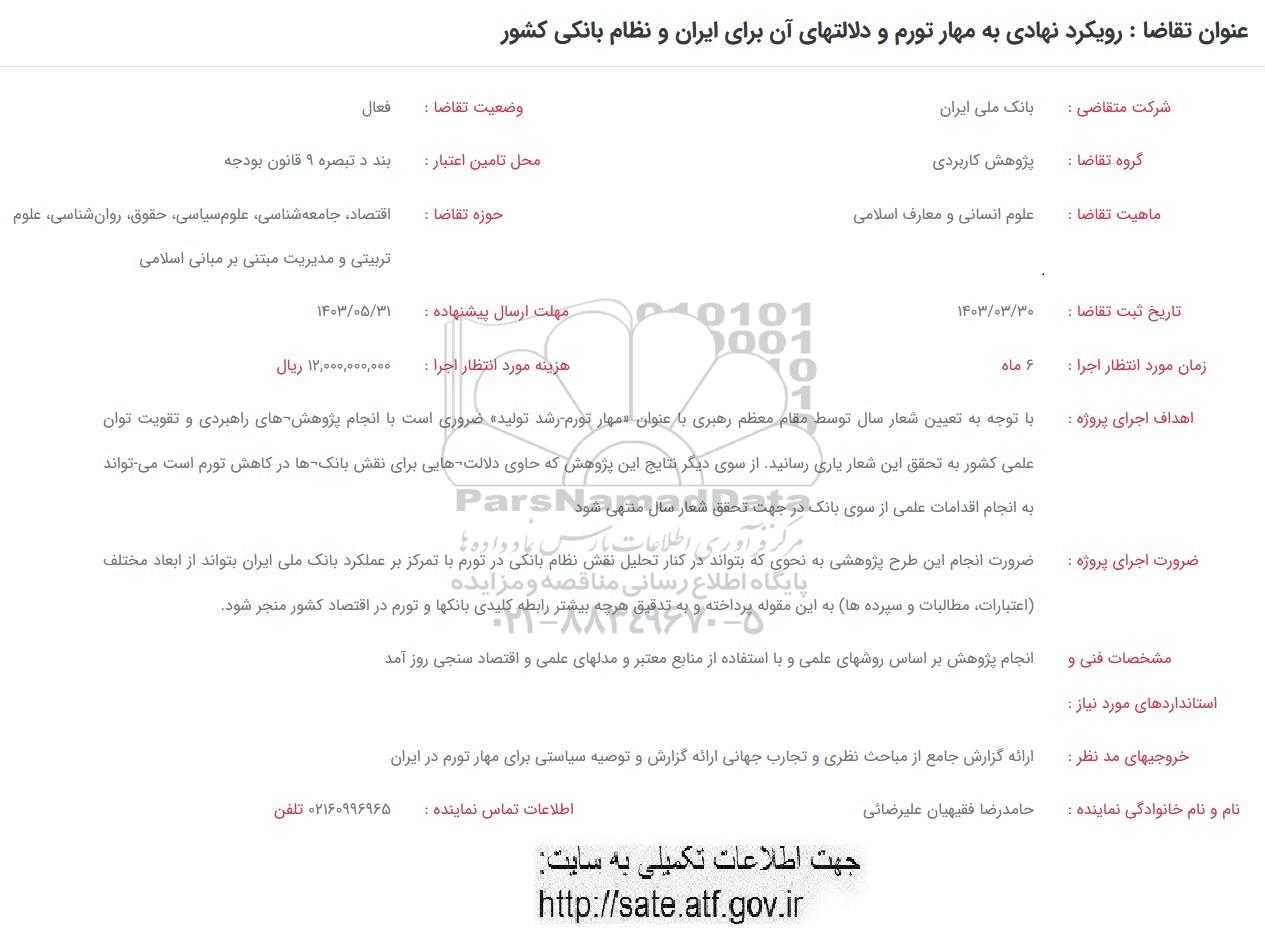 علاقهمندان میتوانند جهت دریافت اسناد و اطلاعات تکمیلی، فراخوان رویکرد نهادی به مهار تورم و دلالتهای آن برای ایران و نظام بانکی کشور با سامانه مناقصات و مزایدات ایران پارسنماد داده ها 88349670 تماس حاصل نمایند.