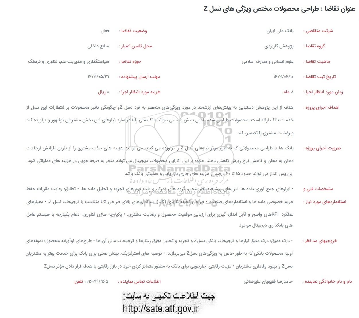 علاقهمندان میتوانند جهت دریافت اسناد و اطلاعات تکمیلی، فراخوان طراحی محصولات مختص ویژگی های نسل Z با سامانه مناقصات و مزایدات ایران پارسنماد داده ها 88349670 تماس حاصل نمایند.