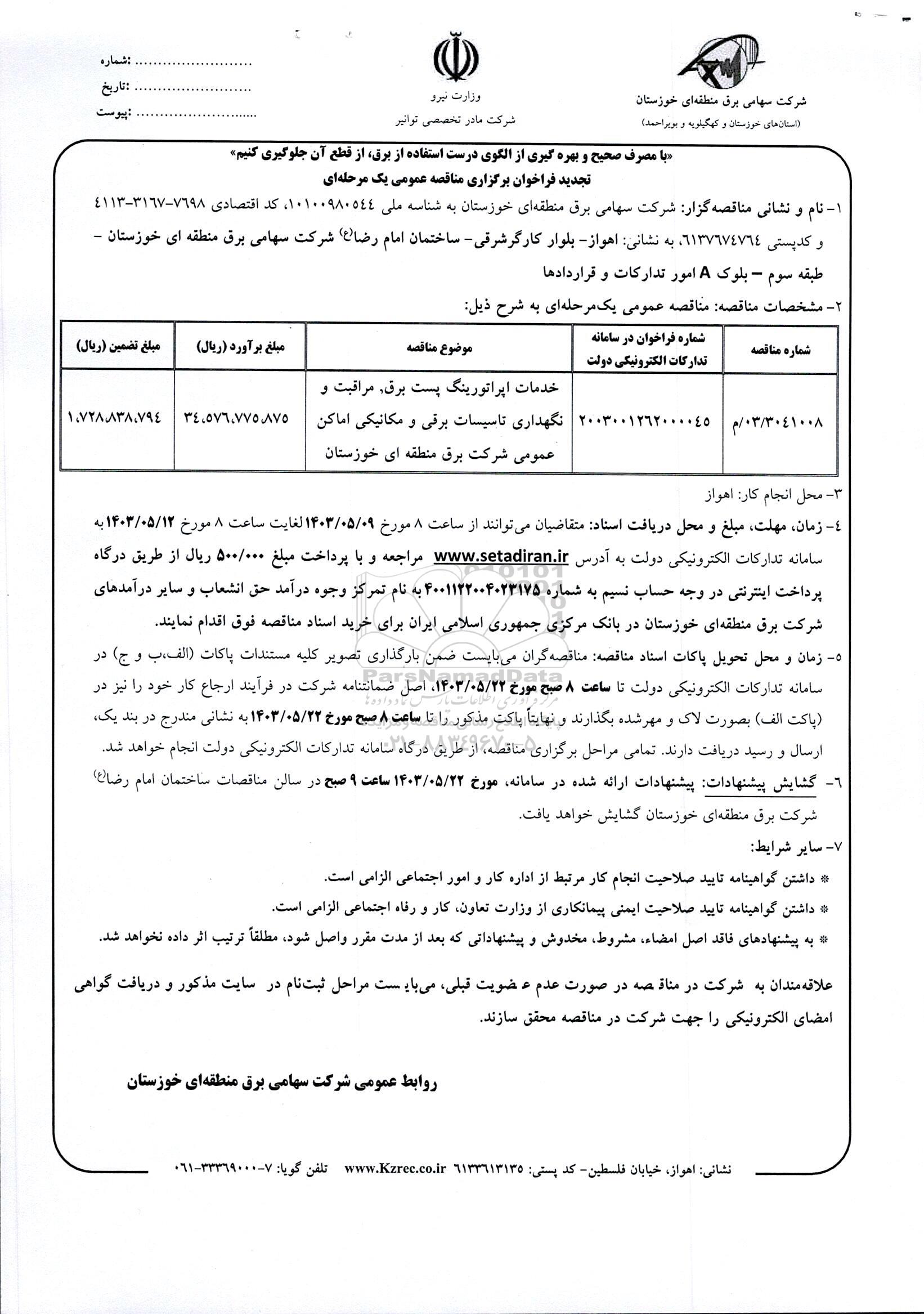 03/3041008/ م | 2003001262000045 | خدمات اپراتورینگ پست برق ، مراقبت و نگهداری تاسیسات برقی و مکانیکی اماکن عمومی شرکت برق منطقه ای خوزستان | 34.576.775.875 | 1.728.838.794 |