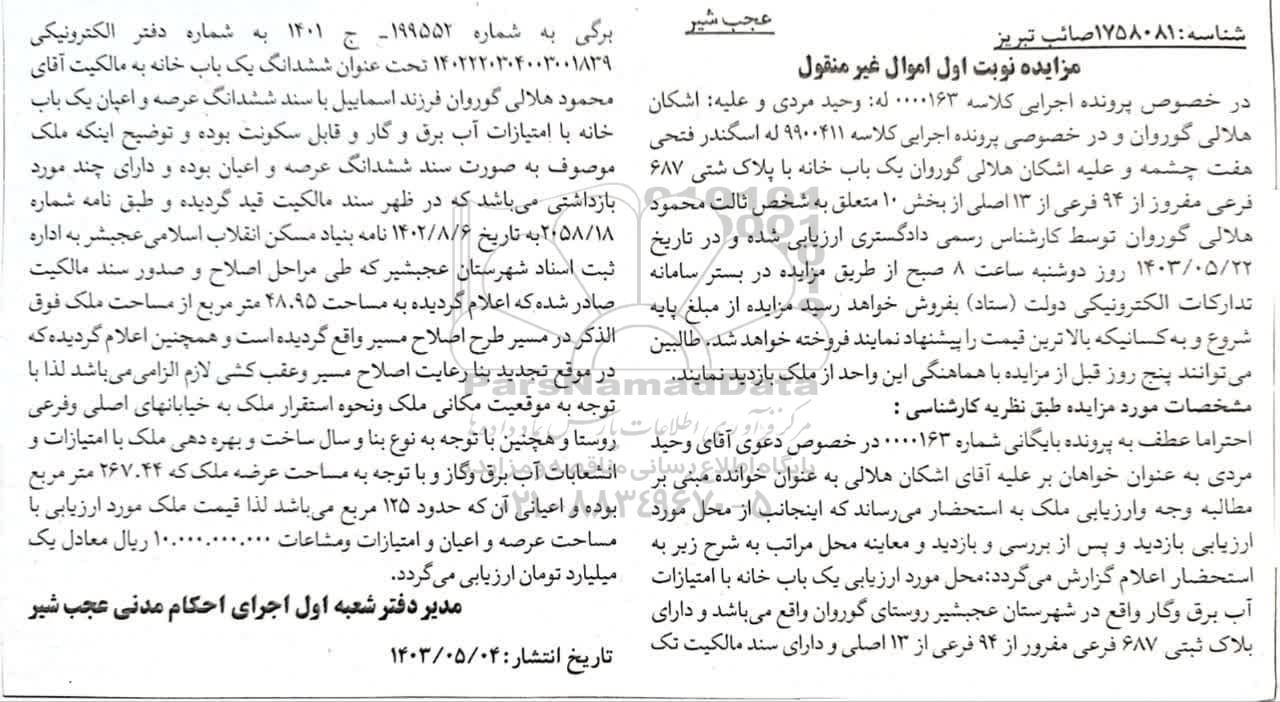 کلاسه 0000163  مزایده یک باب خانه با پلاک ثبتی 687 فرعی مفروز از 94 فرعی از 13 اصلی از بخش 10