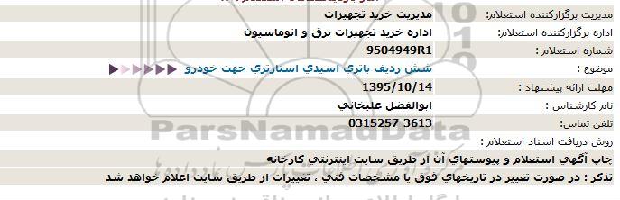 استعلام بها و موضوع استعلام استعلام , استعلام شش رديف باتری اسيدی استارتری جهت خودرو به اطلاع کلیه شرکتها و افراد متخصص واجد شرایط میرساند، آگهی گذار در نظر دارد از طریق استعلام بها، نسبت به انتخاب و دریافت پیشنهادات اقدام نماید. این استعلام با کد آگهی ثبت شده در سامانه خبرگزاری پارس نماد : 778612 منتشر شده است. مشخصات استعلام : تاریخ شروع استعلام: 1395/10/12 آخرین مهلت ارسال پیشنهاد قیمت : 1395/10/14 و محل اجرای پروژه : استان اصفهان میباشد. استعلام قیمت مورد درخواست : استعلام , استعلام شش رديف باتری اسيدی استارتری جهت خودرو با دستهبندیهای تخصصی و گروه های مرتبط : منابع تغذیه, قطعات خودرو, تجهیزات برق و الکترونیک, استعلام اطلاع رسانی میگردد.