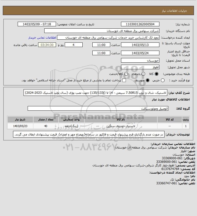 نام سازمان خریدار: شرکت سهامی برق منطقه ای خوزستان